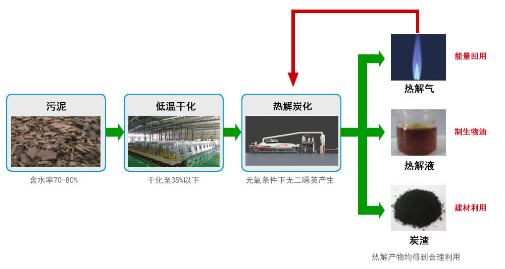 該處置系統(tǒng)干化工藝采用低溫?zé)岜贸凉窦夹g(shù),將去濕干燥與能量回收相結(jié)合,熱量利用率高,能耗低;熱解炭化采用間接加熱技術(shù),整個(gè)反應(yīng)過程處于無氧高溫狀態(tài)下,無害化的同時(shí)回收能源實(shí)現(xiàn)資源化。整體工藝全過程密閉無粉塵,不產(chǎn)生二噁英,不會(huì)產(chǎn)生鄰避效應(yīng),環(huán)境友好度高。